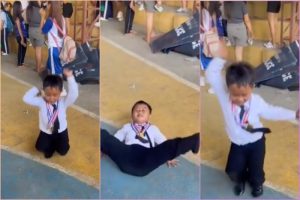In the video, the boy confidently reenacts a well-known performance by Khianna, a contestant from “Drag Race Philippines.” He moves with expressive dance steps and playful gestures, making the audience laugh and cheer. His final move brings the performance to a dramatic close, leaving everyone entertained.