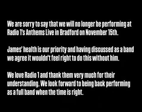 "We are sorry to say that we will no longer be performing at Radio 1’s Anthems Live in Bradford on November 15. James’ health is our priority and having discussed as a band we agree it wouldn’t feel right to do this without him. We love Radio 1 and thank them very much for their understanding. We look forward to being back performing as a full band when the time is right."