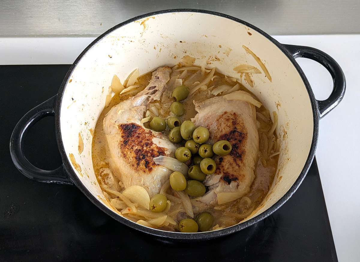 Ten minutes before the chicken is cooked, add the green olives. Stir gently and finish cooking.