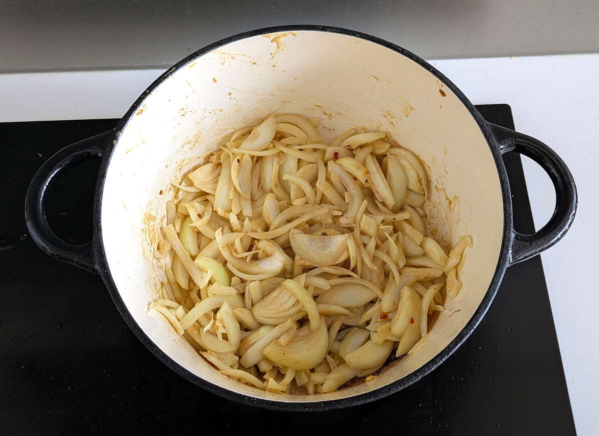 In the same pot, pour the onions with all the marinade and cook them over medium heat for about 15 minutes, stirring often, until they are soft, translucent and lightly browned.