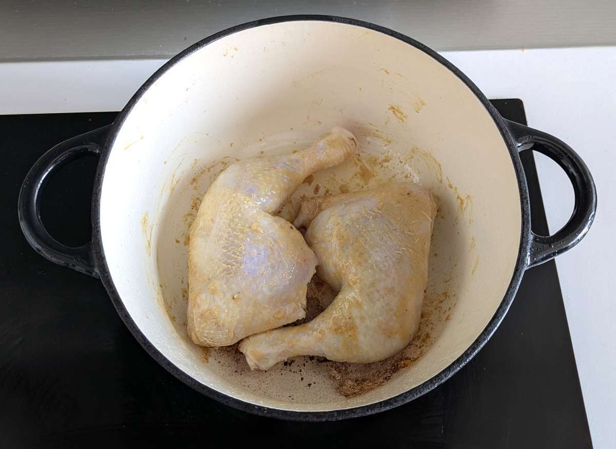 Return the thighs to the pot with the onions, add a cup of water, cover with a lid and cook over medium/low heat for about 40 minutes, stirring every 10 minutes to prevent sticking.