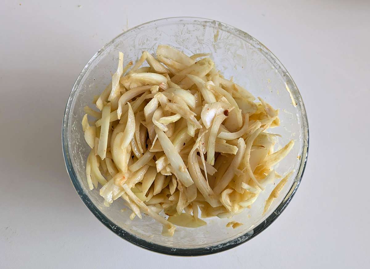 Chop the onions and mix them with the rest of the marinade and vinegar. Allow to season.